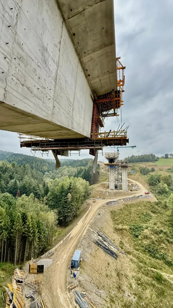 Podczas wizyty poznaliśmy specyfikę ~11-kilometrowego odcinka przez Pogórze Dynowskie i związane z tym wyzwania geotechniczne fliszu karpackiego. Oglądaliśmy budowę spektakularnych estakad o filarach sięgających ~80 m, realizowanych metodą nasuwania podłużnego oraz metodą nawisową. Takie doświadczenia wprost przekładamy na naszą praktykę projektową.